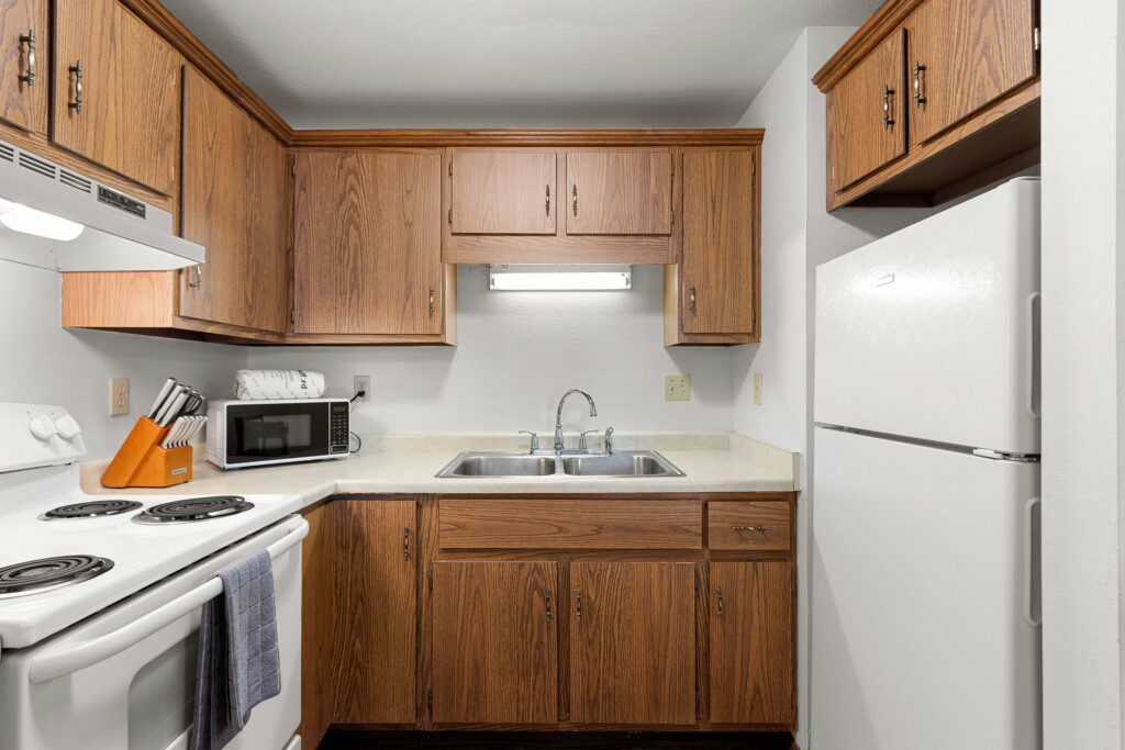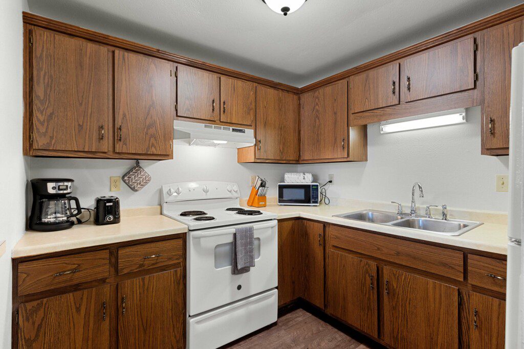 The kitchen features intimate pass-through seating for 2 or off-kitchen dining for 4 and is well stocked with all the cookware and gadgets you’d need.