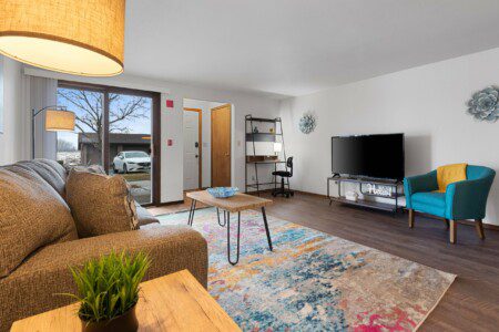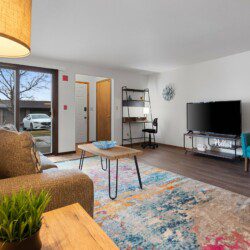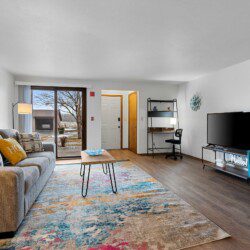 This bright, one-bedroom apartment with king sized bed features ample closet space and a spacious living room with smart tv and workspace.
