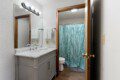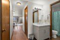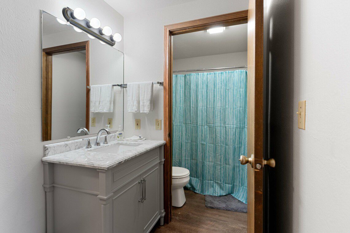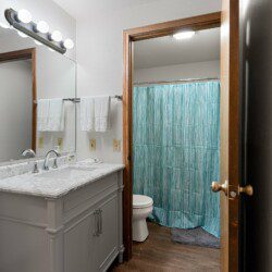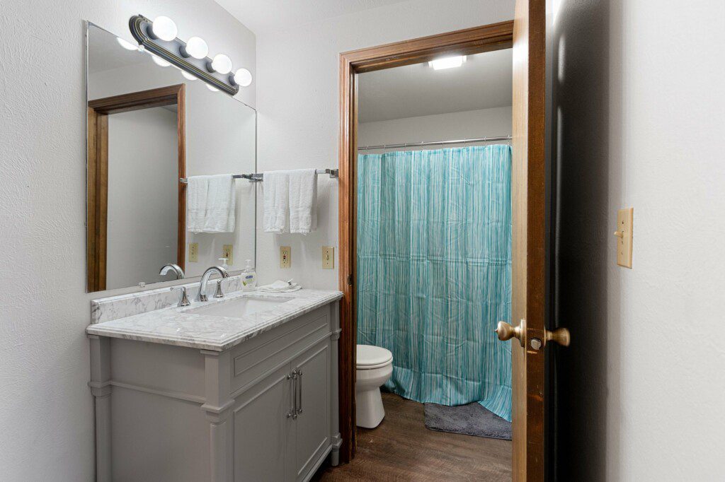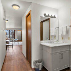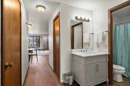 The bathroom features a tub/shower and toilet with a vanity outside of the door for use while the bathroom is occupied.